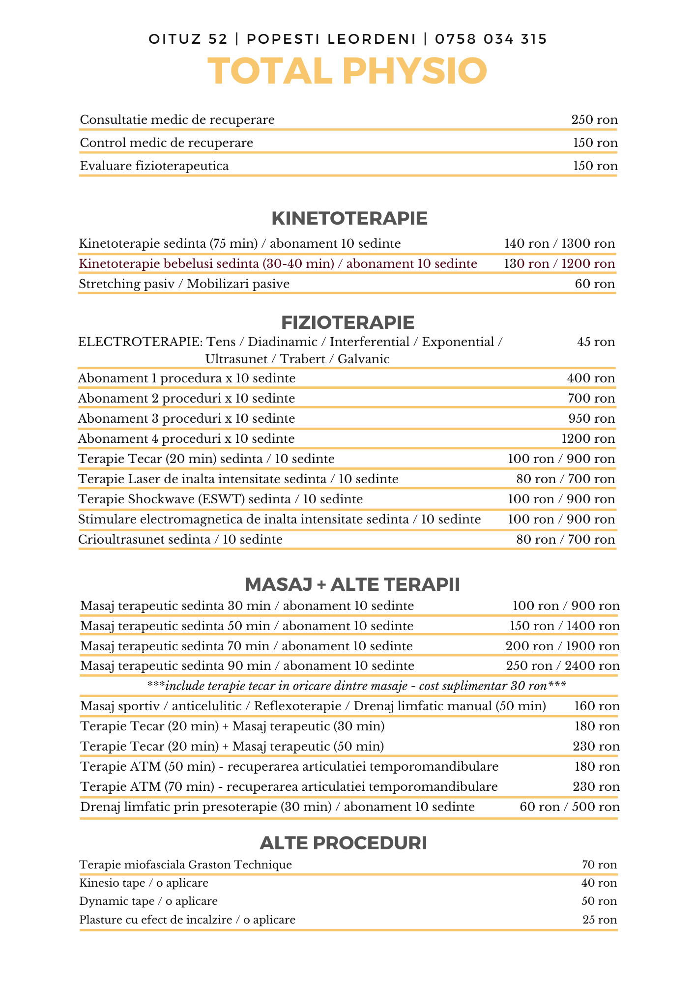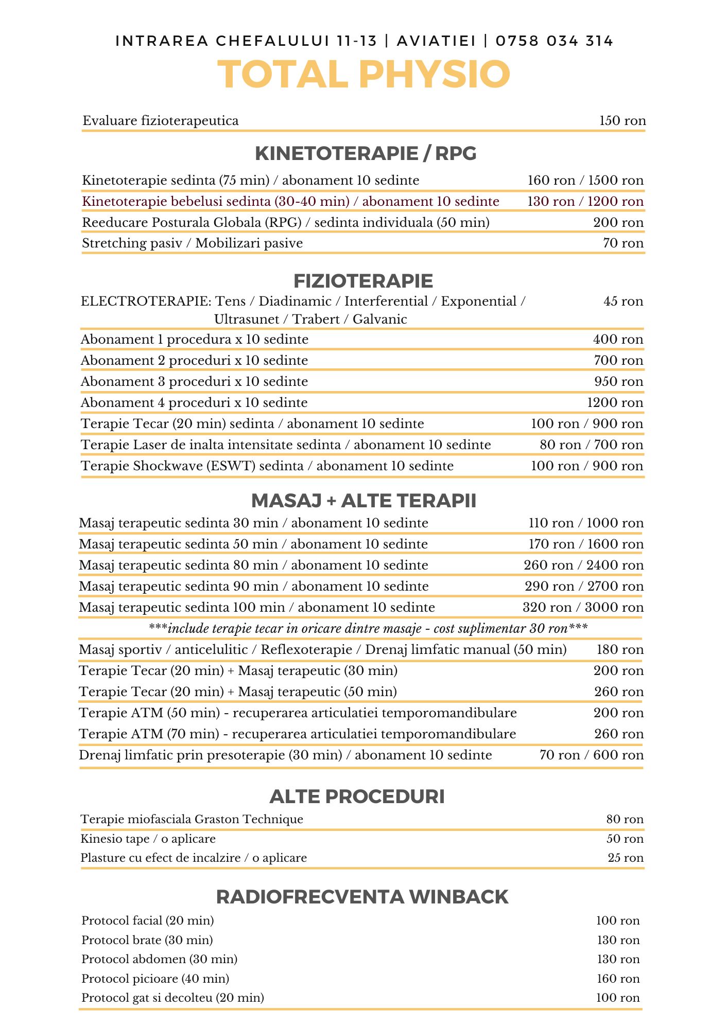 AVIAȚIEI POPEȘTI LEORDENI Clinicile Total Physio își rezervă dreptul de a schimba, de a corecta, de a modifica, de a adăuga și/sau retrage în parte sau în întregime Listele de Preturi fără nicio notificare prealabilă.